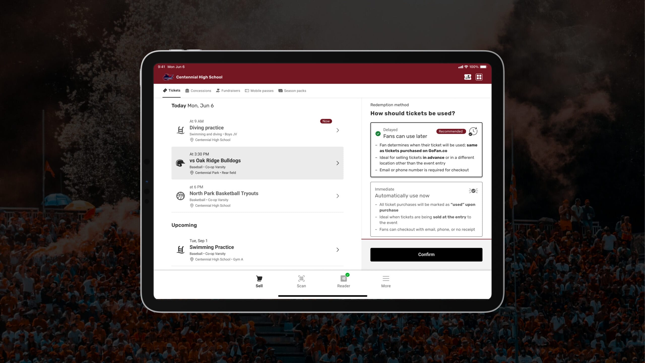 I designed the redemption method feature which is a single, real‑time tile toggle that lets schools or ticket takers decide—per product type—in seconds whether tickets, passes, or season packs are redeemed on the spot or later, without adding any extra steps for volunteers. Changing methods can be done on the fly with a persistent button where the ticket taker can pick: